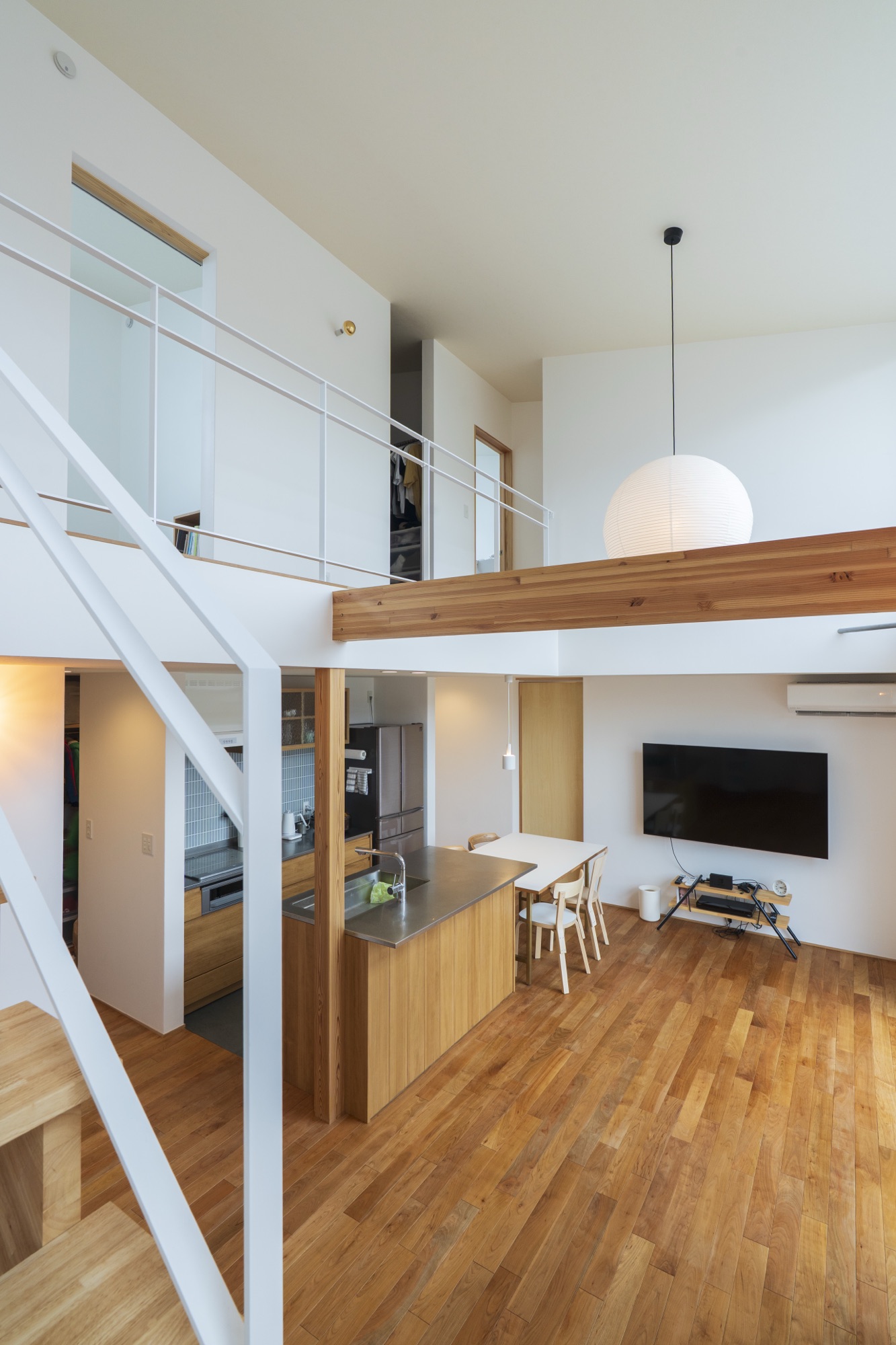 吹き抜けの中心に設置した丸いペーパーシェードは、まるでおうちのシンボルのよう。