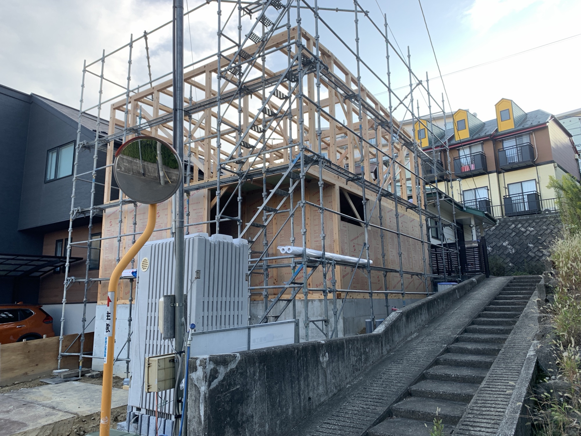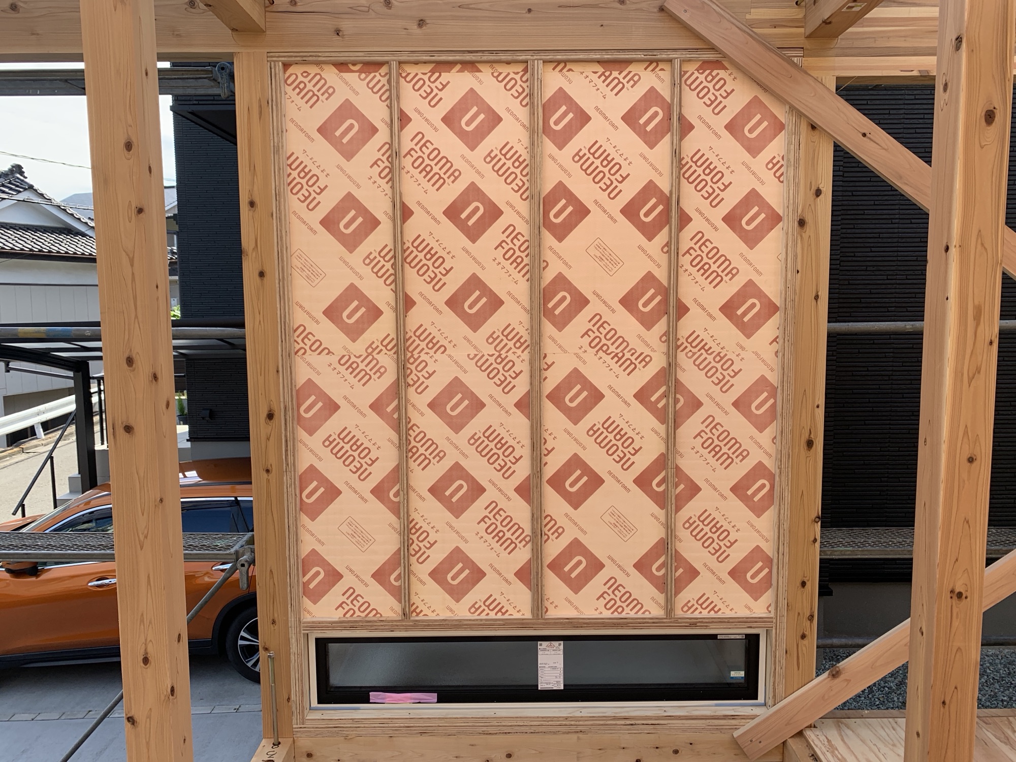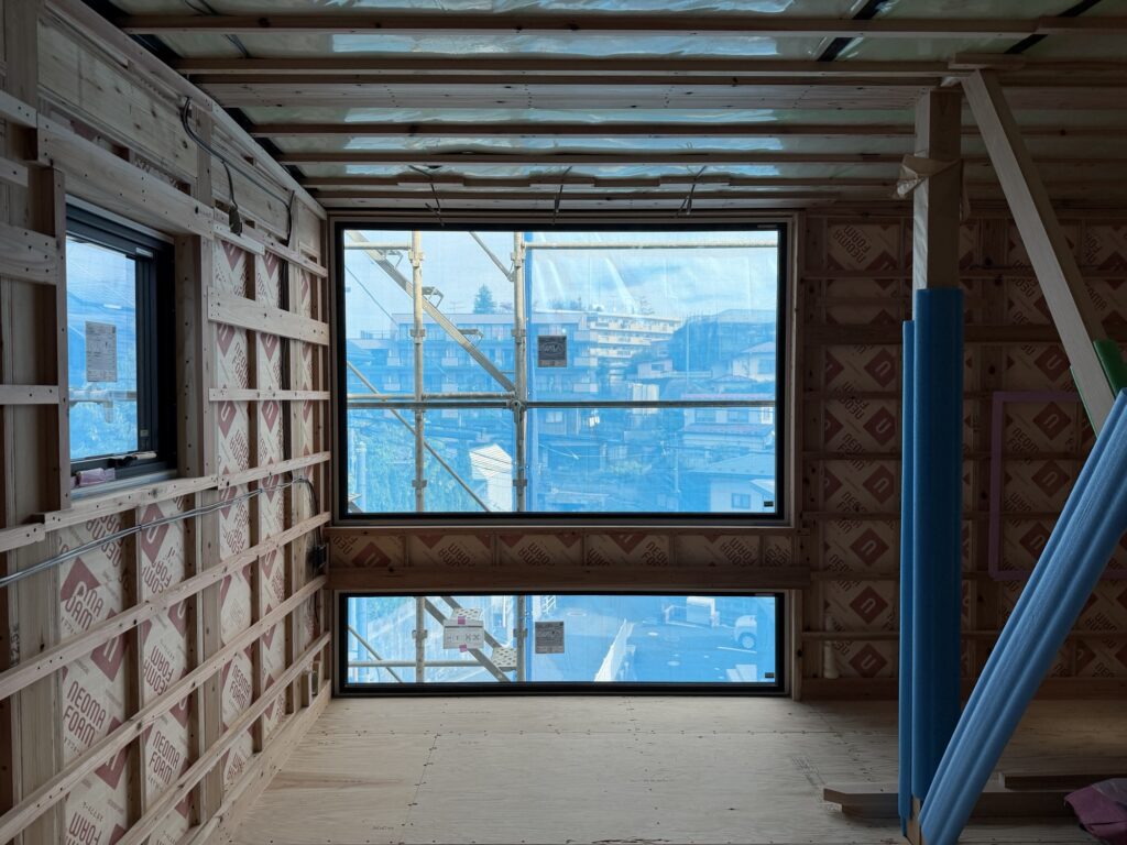 工法は弊社の標準の軸組工法ですが、今回は窓付きパネル工法を採用。