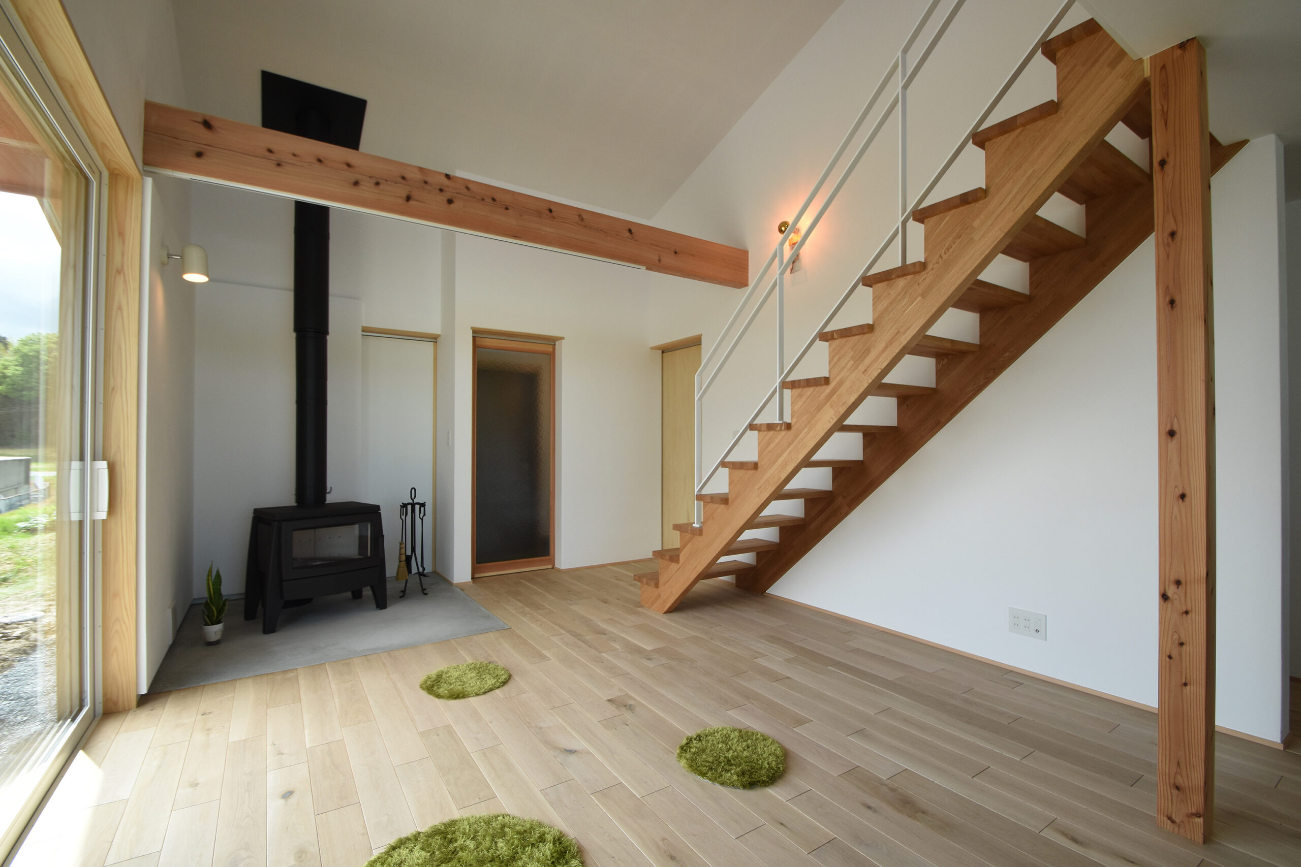 雛壇のように高低差のある変形地に建つ住まい。設計力とアイデアでこの土地の個性を活かし、積極的に自然光を引き込む工夫が随所に施されています。やさしい光に包まれるリビングは、大開口から光が降り注ぐ、明るく落ち着いた空間。薪ストーブの炎が心を癒し、冬もあたたかく過ごせる、アナログとデジタルが調和する暮らしを叶えました。