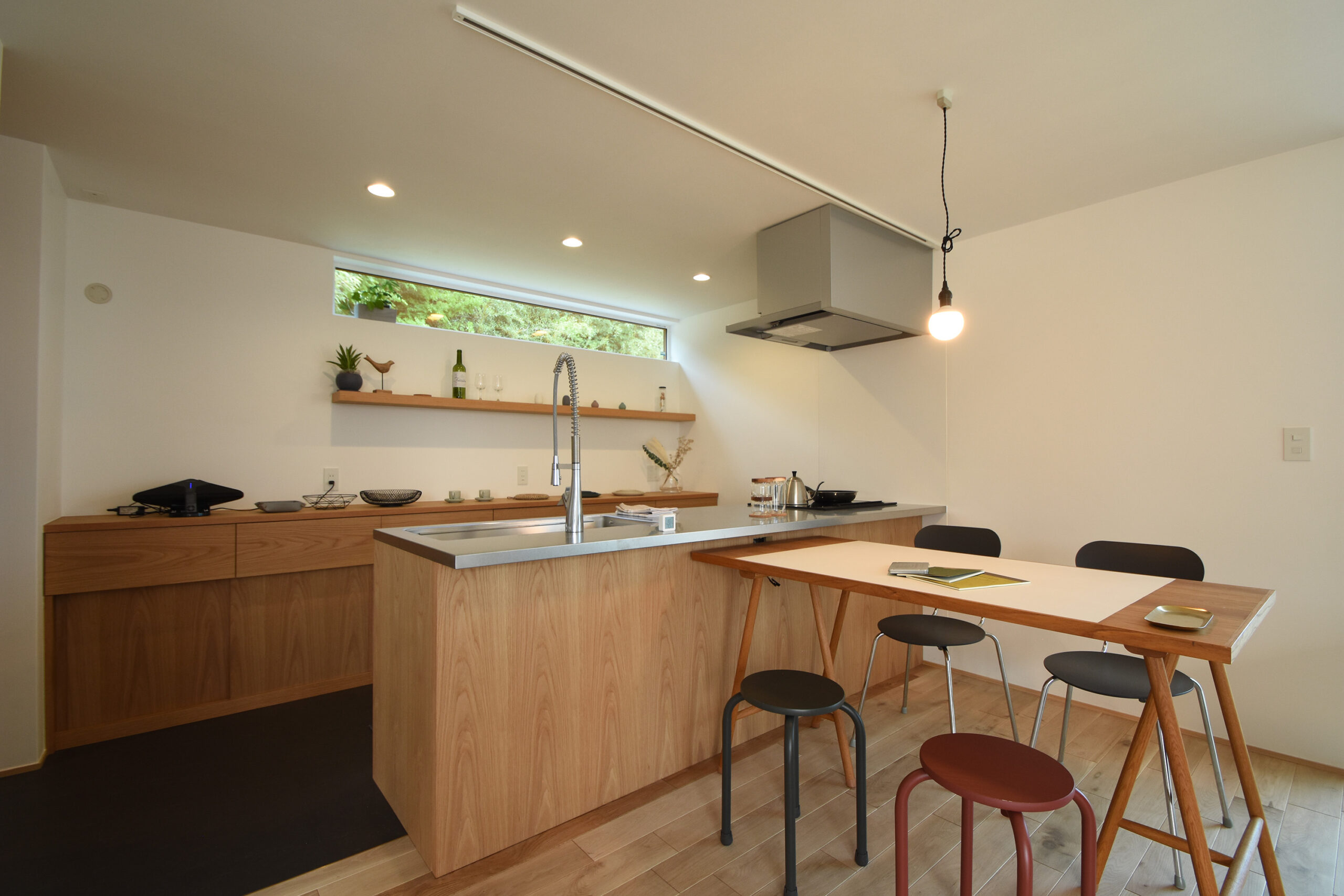 大きな窓から光が広がる、キッチンとリビングの一体感が心地よい空間