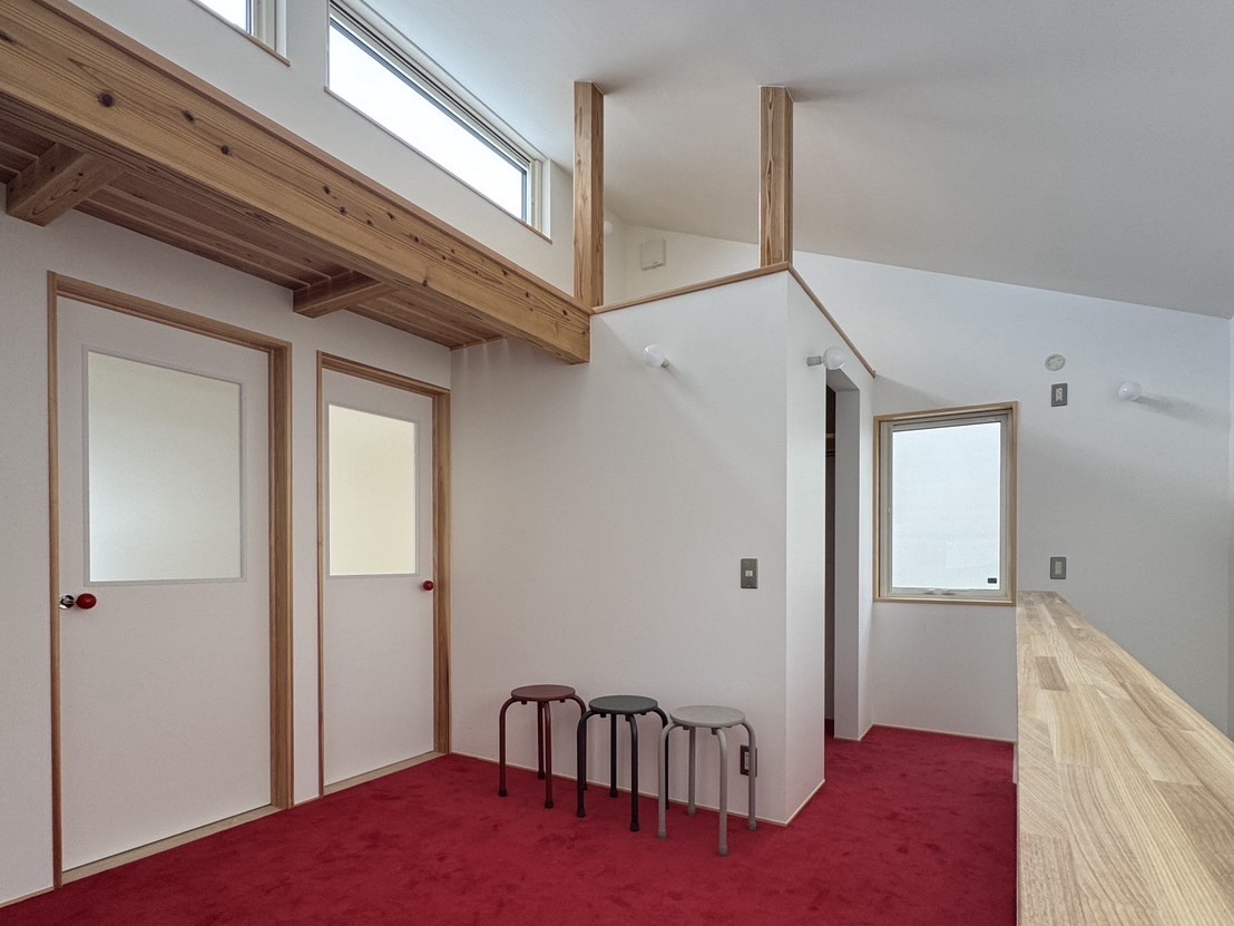 2階ホールには、カーペットを敷き込むことで、足触りのよさと上質な仕上がりを両立。住宅全体が、オーナーの「唯一無二」を表現する、創造性と実用性を兼ね備えた空間です。