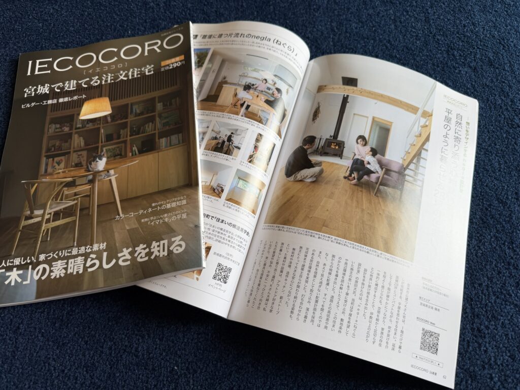 2026年2月9日に求人ジャーナルから発売されました「IECOCORO 宮城で建てる注文住宅」2026春夏号、P62.63にて、当社negla設計室の住宅事例「雛壇に建つ片流れのnegla」が紹介されました。