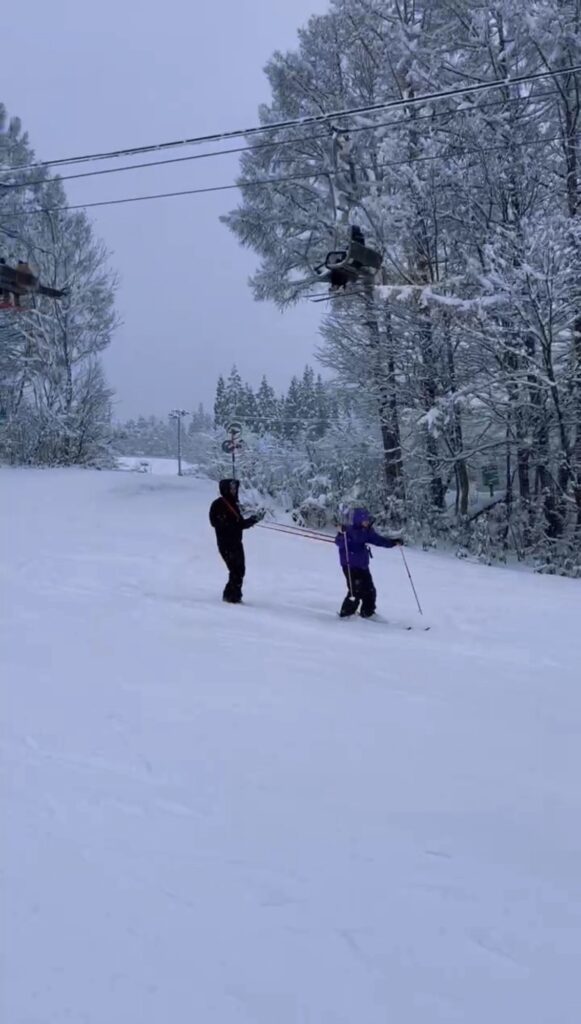 滑れるようになるため、娘に紐を括り付け、